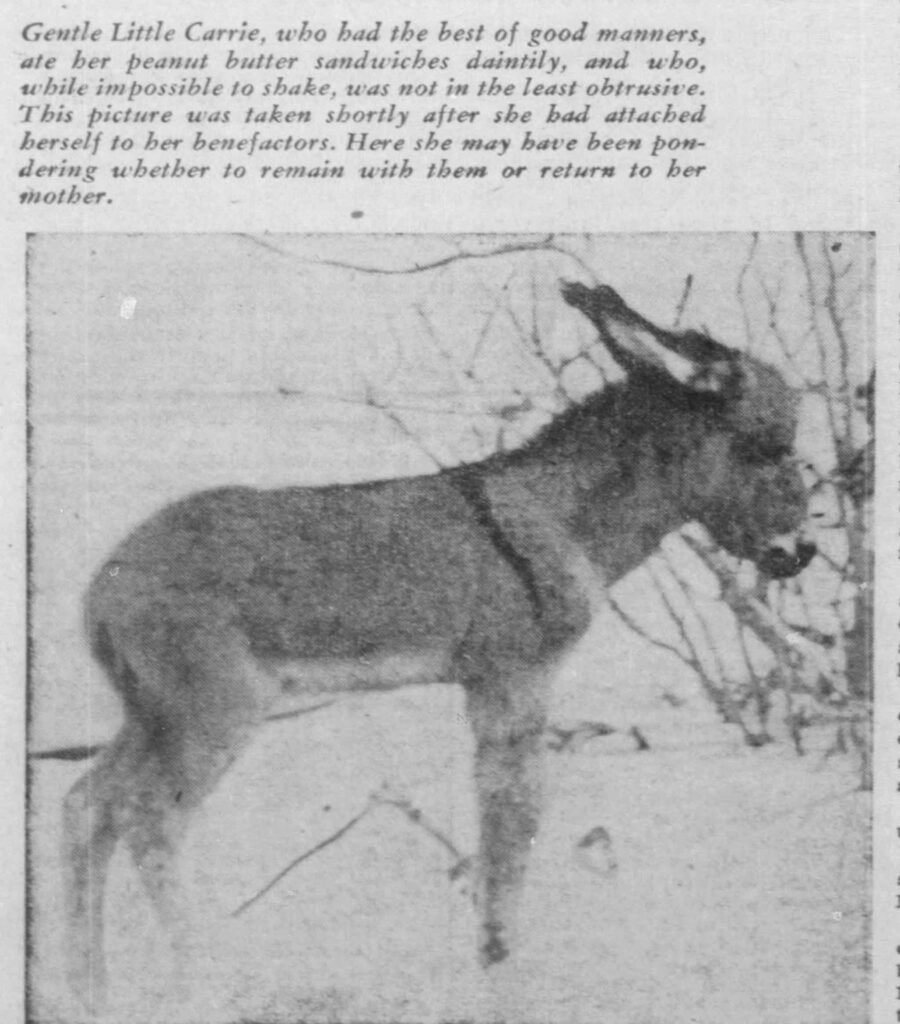 In a way, extinction was a kind of reward; the donkeys had borne the bitterness of exile with a fortitude that deserved its rest. At least one member of the clan—Little Carrie—stirred human compassion, left memories still strong after a quarter-century, and proved that her kind is more lovable and intelligent than tradition allows. Perhaps the peg-leg doctor would have christened her Stella—Star of the Eastern Island Nightingales.